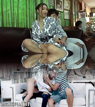 Horny Korean mature fuckslut loves being in the middle of a spitroast