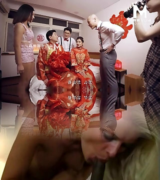 Sweet asian teenage gets collective by two lustful guys in bed after the wedding