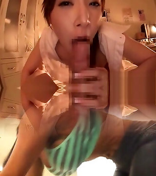 Torrid and wondrous Japanese porn star student Saki Ayano sucking and stroking a hard cock